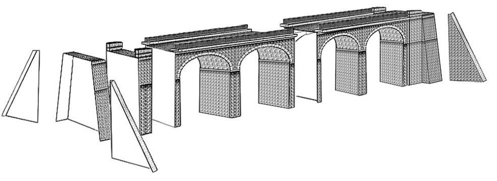 Der Viadukt ist für zweigleisigen Fahrbetrieb ausgelegt, kann aber durch entsprechendes zuschneiden der Teile in der Breite, wie auch in der Höhe und Länge problemlos angepasst werden. Die mehrteiligen Brückenköpfe sind ebenfalls variabel aufbaubar. Durch den Einbau von weiteren Segmenten lässt sich der Viadukt auch in der Länge beliebig erweitern.