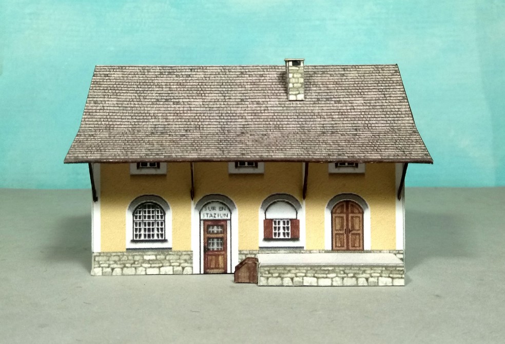 Ein kleinerer Bahnhof, wie er bei der Rhätischen Bahn (RhB) zu finden ist. Das Stationsgebäude hat kein konkretes Vorbild, orientiert sich jedoch an den für das Engadin typischen Bauformen.